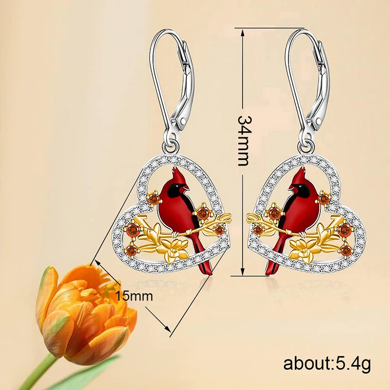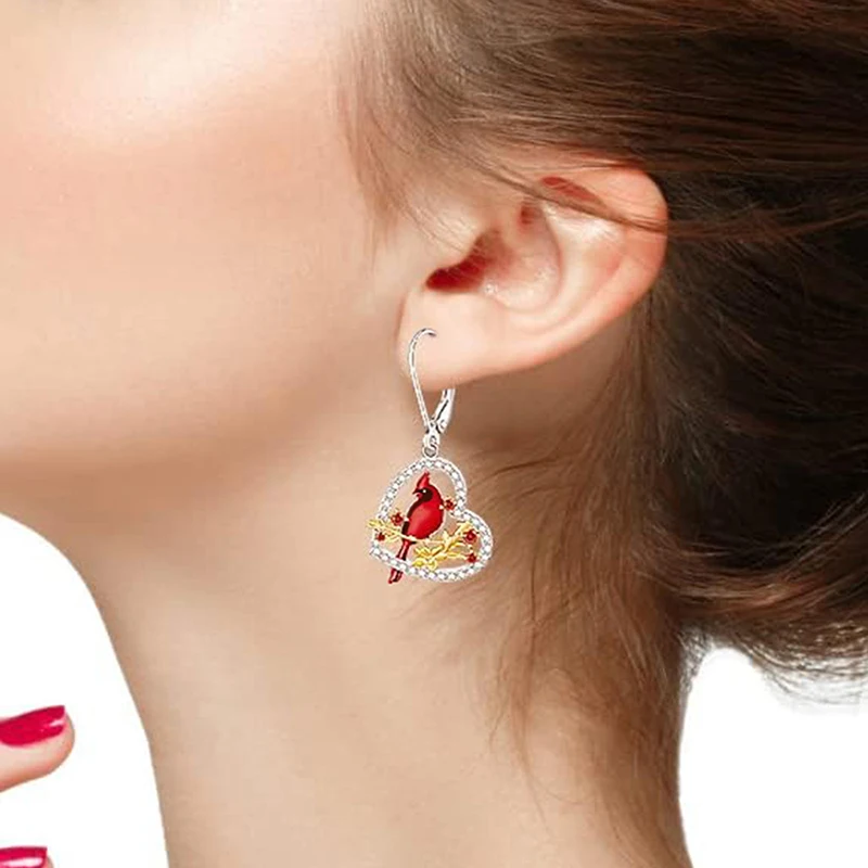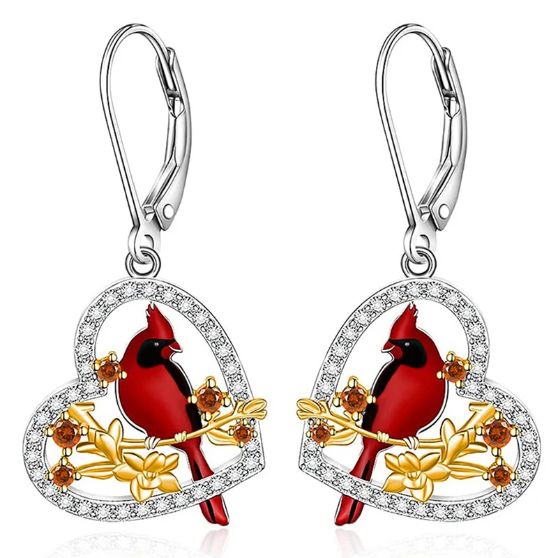 Huitan Fancy Red Bird Enamel Dangle Earrings for Women Gold Color Flower Heart Drop Earrings Anniversary Gift Fashion Jewelry