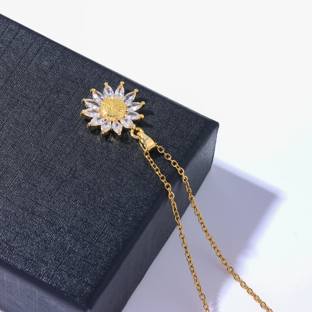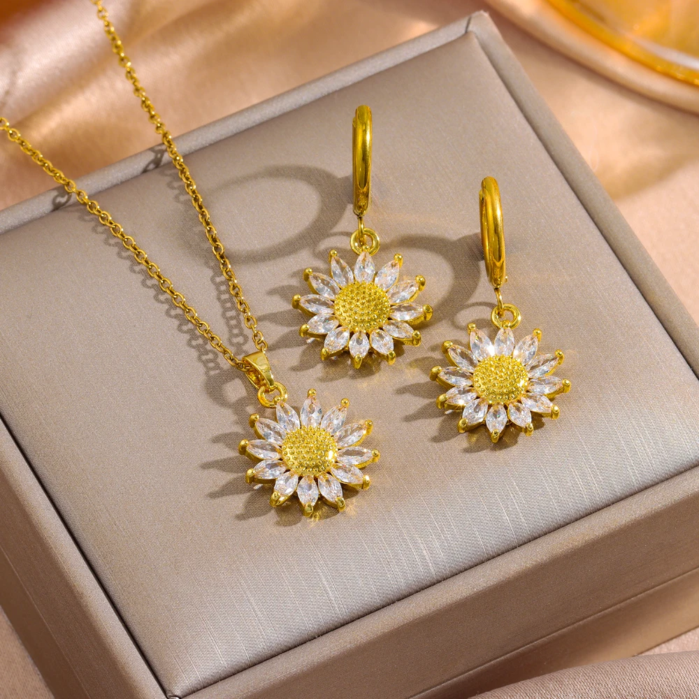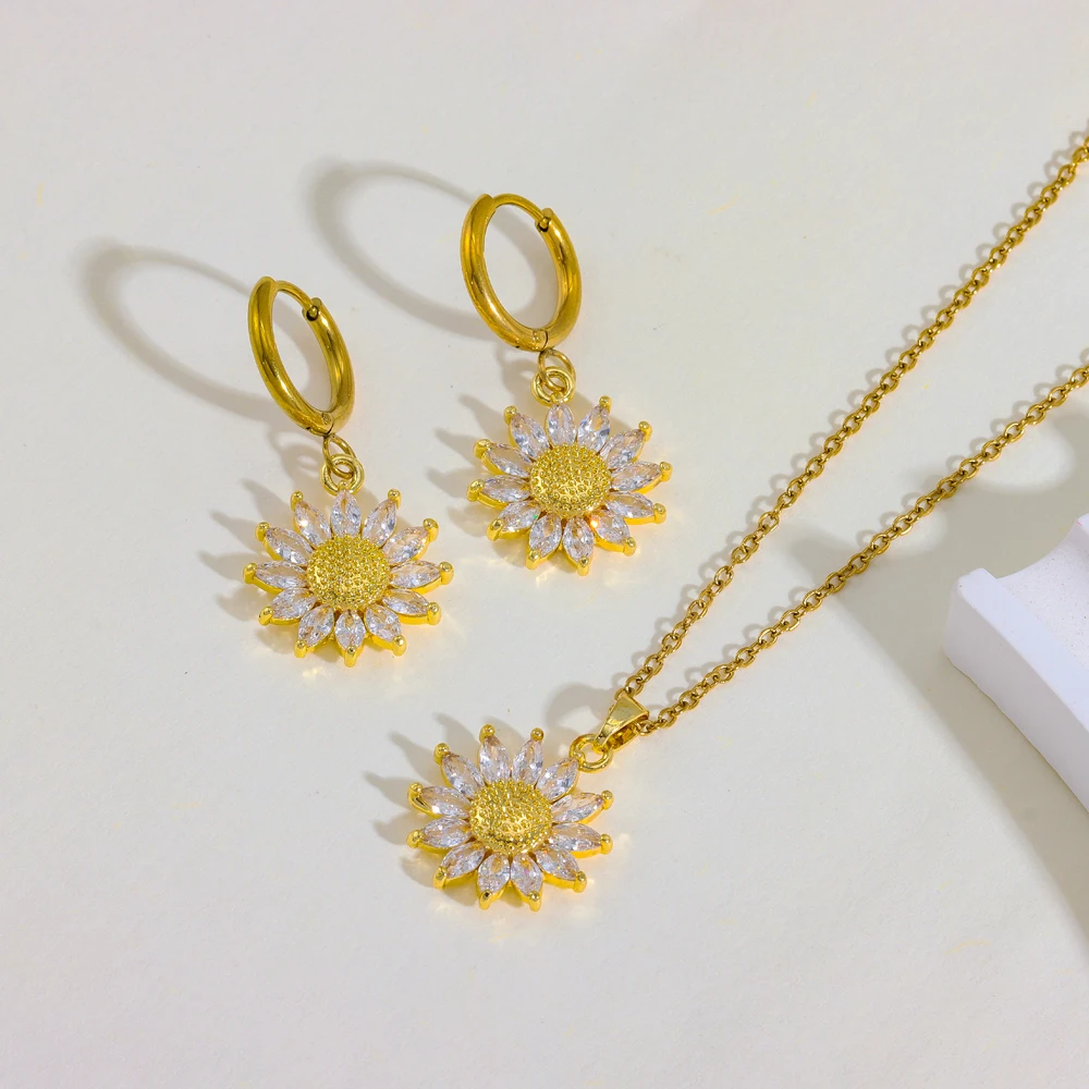 Sweet Sexy Zircon Crystal Sunflower Necklace Earrings For Women Luxury 18K Gold Plated Female Stainless Steel Jewelry Set Female